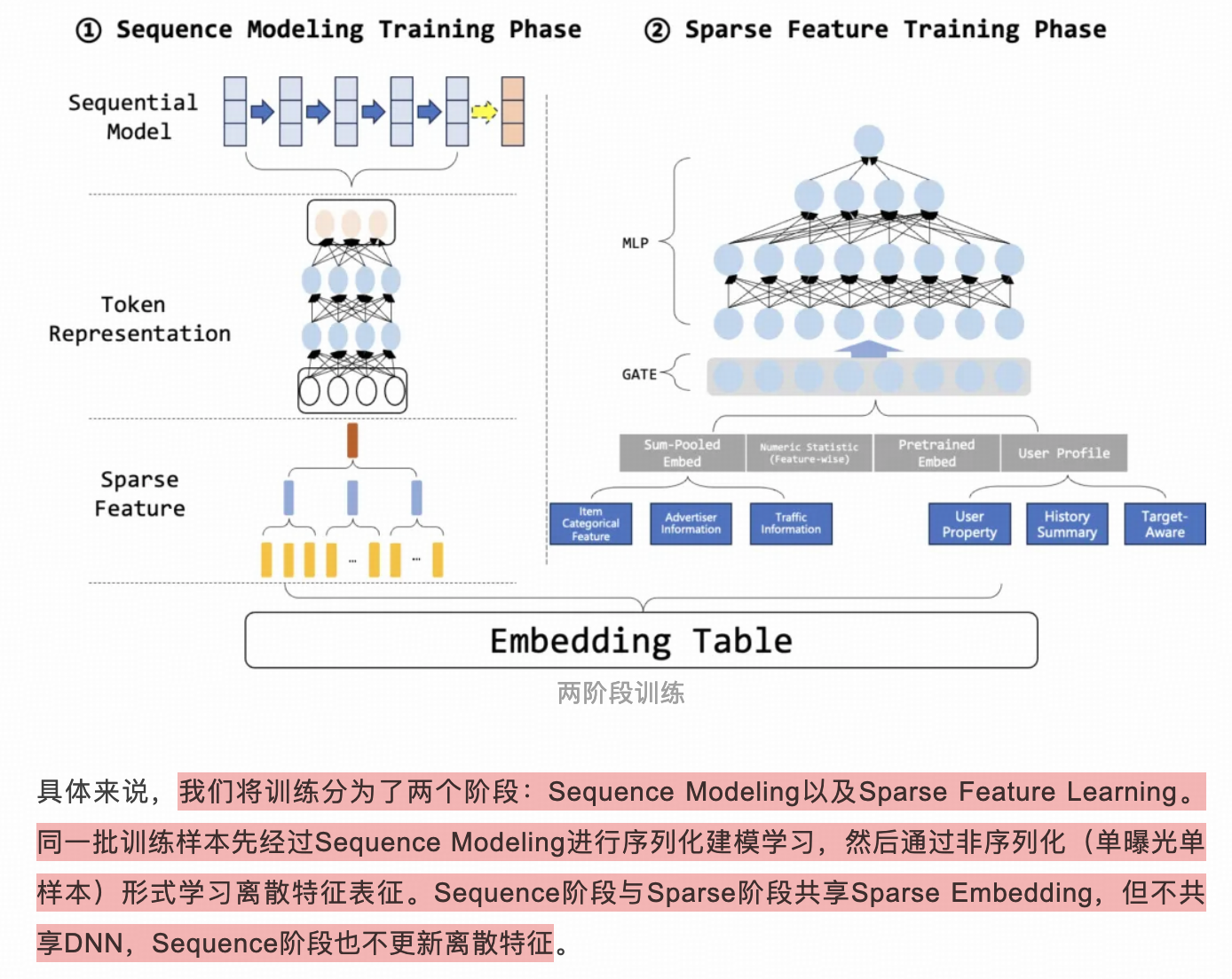 上面MTGR中提到的按用户粒度组织训练样本的问题,这篇文章给了解决方案。依然是百度祖传的两阶段训练,第一阶段固定sparse只训sequence nn,第二阶段采用单曝光样本的形式学习sparse和独立nn(这里的nn辅助sparse学习,不用于serving)。但这里引申出新问题,独立nn学习出来的sparse emb和sequence nn不匹配。