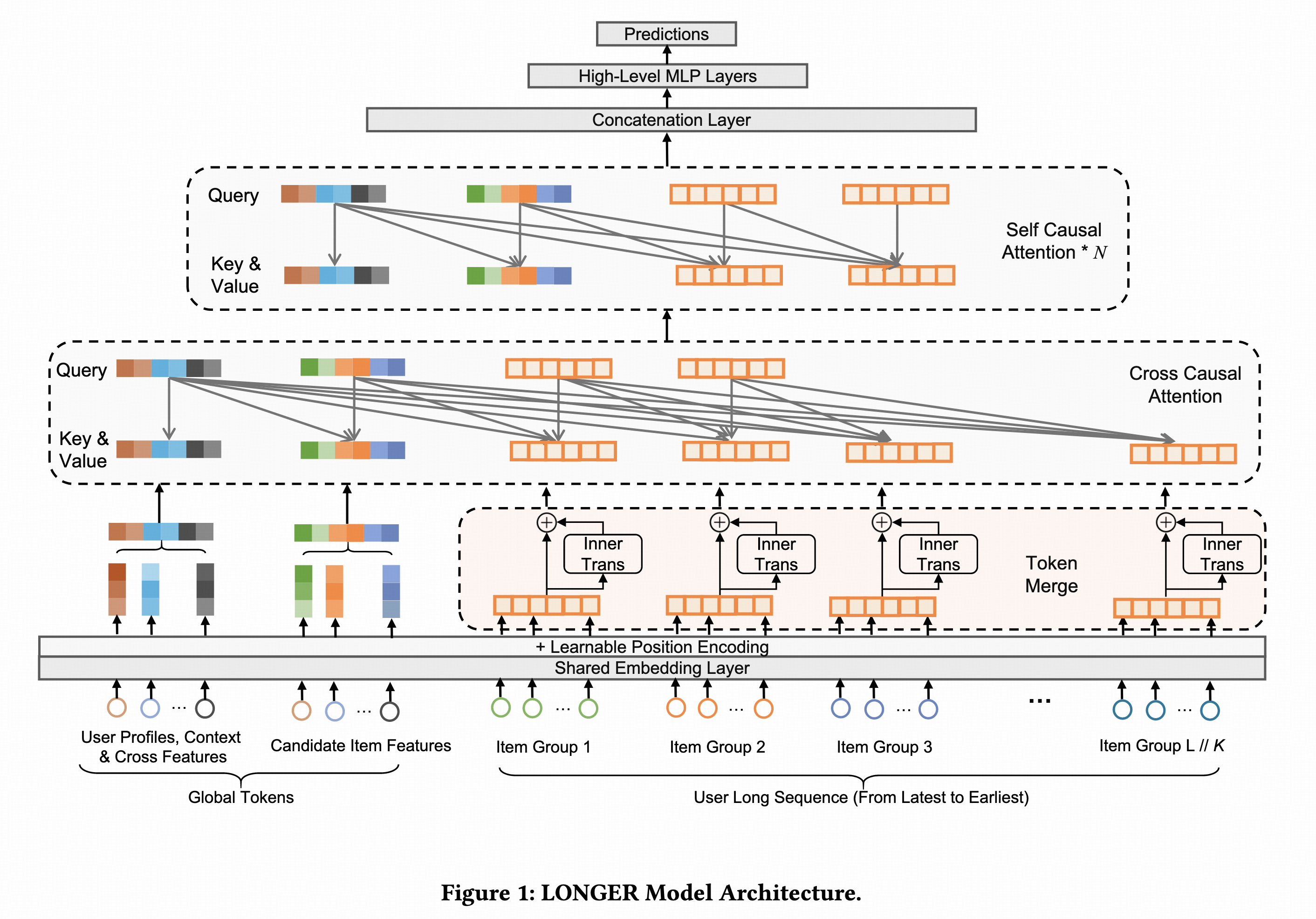 序列特征中每个行为是一个token,非序列特征中每个特征是一个token。假如输入特征中,序列特征长度S,非序列特征长度N。第一层,将序列按时间顺序排列,每K个临近token通过InnerTrans聚合成一个token,序列长度从S降为S/K,第一层输出token数量是N + S/K。论文中序列长度2000,K=4可以降为500。第二层,使用最近的k个token作为query,key和value还是全部序列,其中k < S/K < S,通过causal