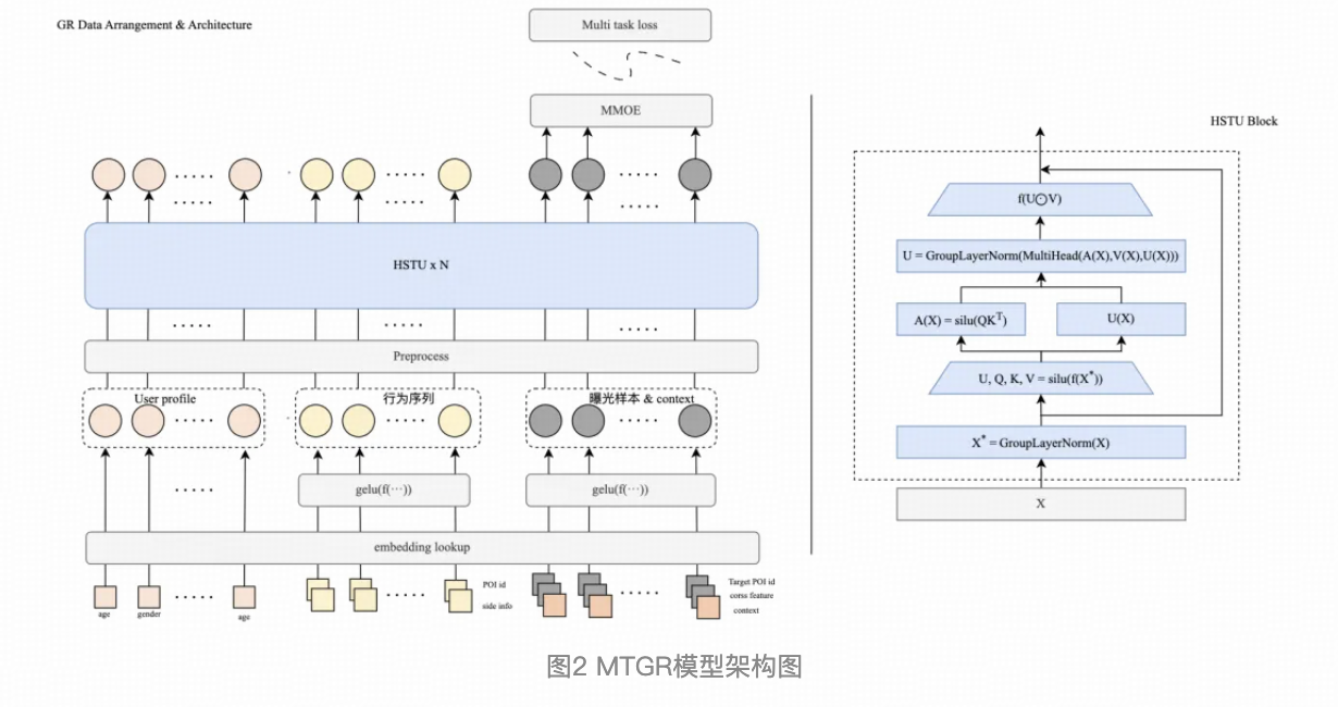 模型层面,没有采用经典transformer结构,而是设计了全新的HSTU,其中attention方式和mha差别较大。多层交叉后,使用曝光item的token hidden emb,后接一个多目标网络进行打分。